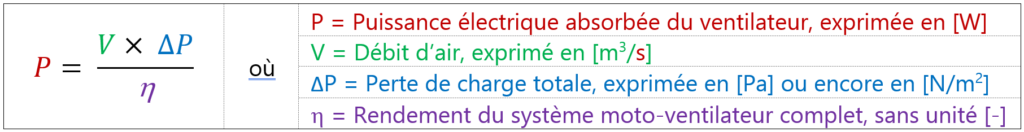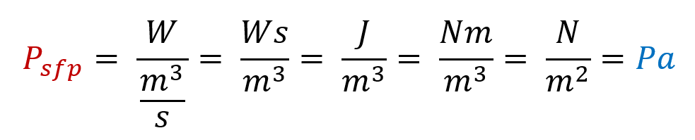 Le Psfp ainsi obtenu est exprimé en W/(m3/s) alors qu’on l’utilise plus généralement sous sa forme W/(m3/h) pour une meilleure compréhension au quotidien. Pour passer de W/(m3/s) en W/(m3/h) il faut diviser par 3600.